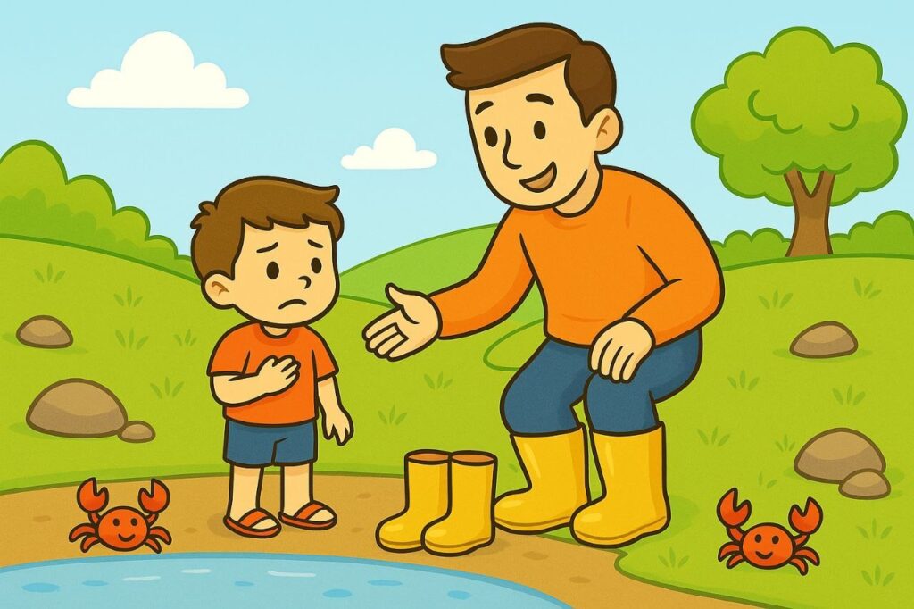 “Con đừng lo, bố có đem theo ủng đây. Chúng ta chỉ cần đeo ủng vào thì đi qua suối sẽ không bị ướt, mình sẽ tránh cua ra nhưng lỡ có đụng vào con nào thì nó sẽ không kẹp chân mình được đâu. Vì mình đã có ủng cơ mà. Đeo ủng vào đi chắc chân, đỡ bị trượt hơn đi dép. Và con chỉ cần nắm chặt tay bố thì dù con có trượt cũng sẽ không ngã được. Bố cũng nắm tay con cơ mà!”