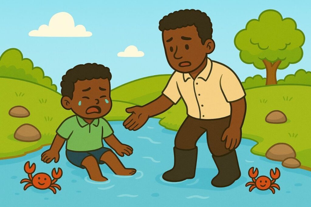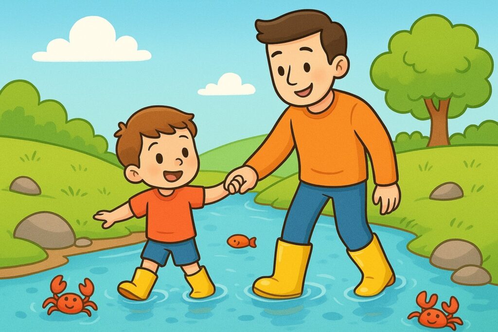 Bạn nhỏ trong câu chuyện khi nghe bố nói cần đi qua suối thì bạn lại sợ cua kẹp, sợ trượt ngã. Thành ra bạn không muốn qua mà lại rủ bố chơi ở bên này thôi. Khi đó bố đã an ủi bạn rằng không sao, chỉ cần bạn đeo đôi ủng bố cho và hai bố con nắm chặt tay nhau thì bạn sẽ không ngã được và không bị cua kẹp chân, bố muốn giúp cho bạn đừng lo lắng sợ hãi gì.