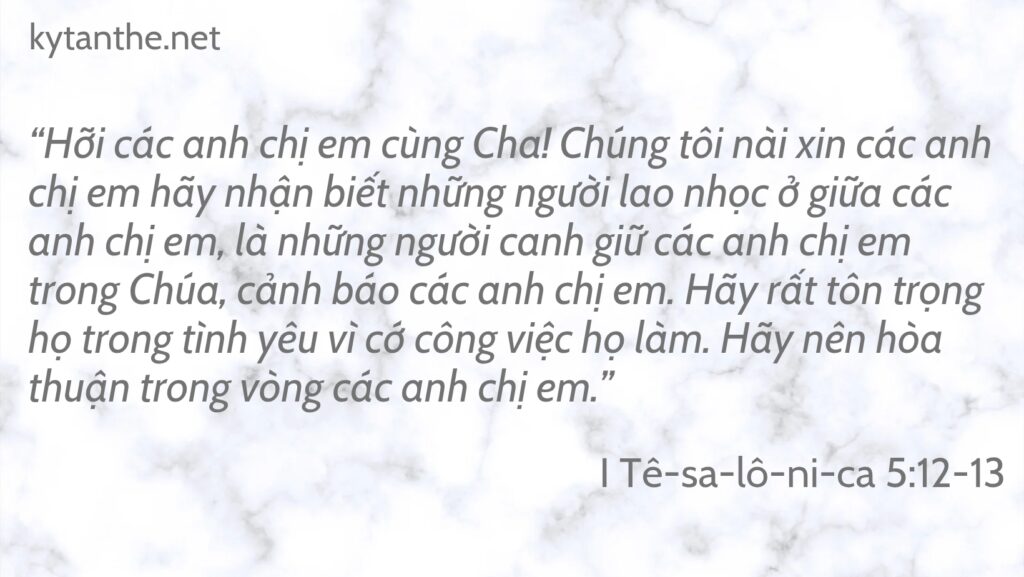 “Hỡi các anh chị em cùng Cha! Chúng tôi nài xin các anh chị em hãy nhận biết những người lao nhọc ở giữa các anh chị em, là những người canh giữ các anh chị em trong Chúa, cảnh báo các anh chị em. Hãy rất tôn trọng họ trong tình yêu vì cớ công việc họ làm. Hãy nên hòa thuận trong vòng các anh chị em.” (I Tê-sa-lô-ni-ca 5:12-13).