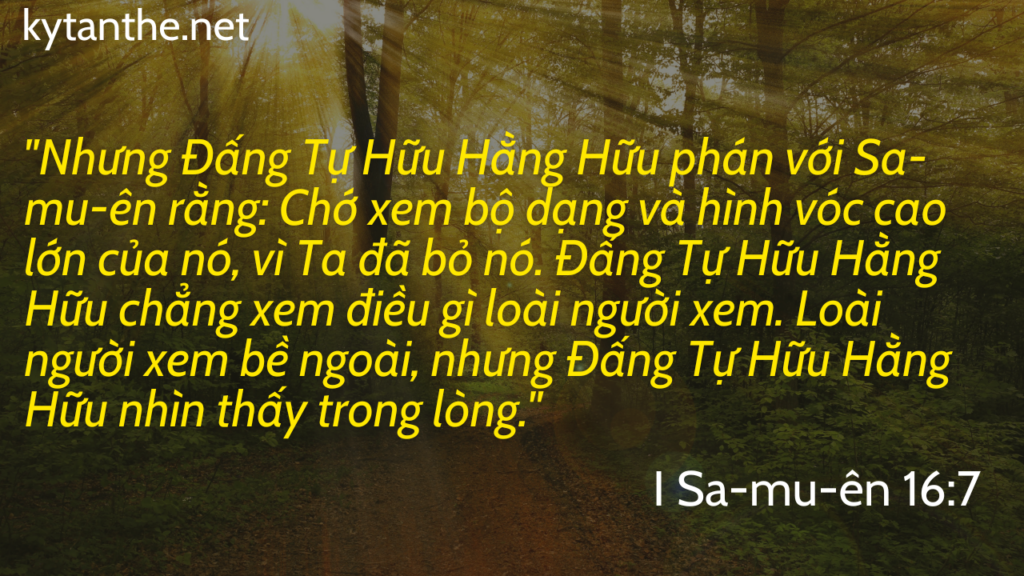 “Nhưng Đấng Tự Hữu Hằng Hữu phán với Sa-mu-ên rằng: Chớ xem bộ dạng và hình vóc cao lớn của nó, vì Ta đã bỏ nó. Đấng Tự Hữu Hằng Hữu chẳng xem điều gì loài người xem. Loài người xem bề ngoài, nhưng Đấng Tự Hữu Hằng Hữu nhìn thấy trong lòng”. (I Sa-mu-ên 16:7).