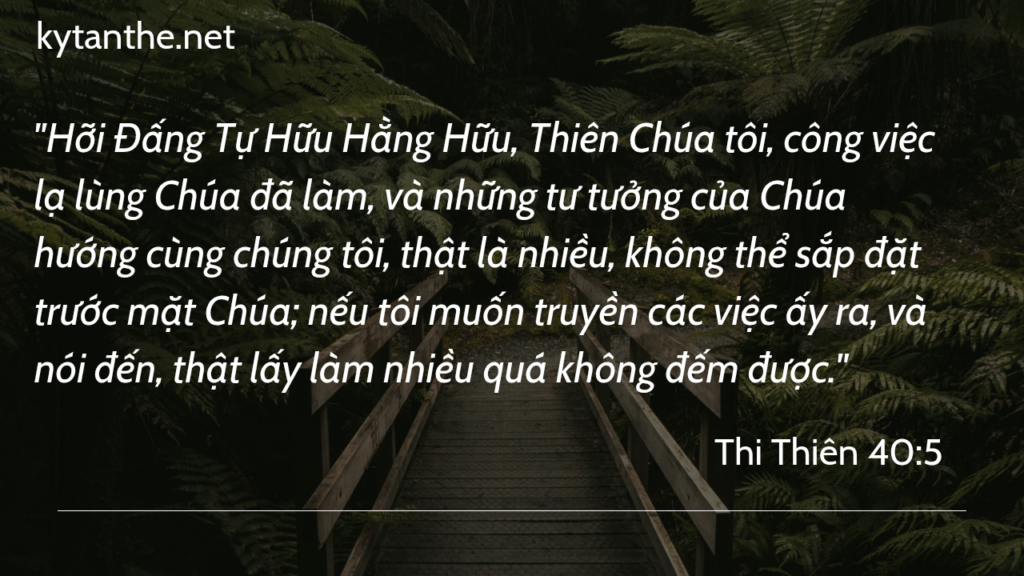 “Hỡi Đấng Tự Hữu Hằng Hữu, Thiên Chúa tôi, công việc lạ lùng Chúa đã làm, và những tư tưởng của Chúa hướng cùng chúng tôi, thật là nhiều, không thể sắp đặt trước mặt Chúa; nếu tôi muốn truyền các việc ấy ra, và nói đến, thật lấy làm nhiều quá không đếm được.” (Thi Thiên 40:5).