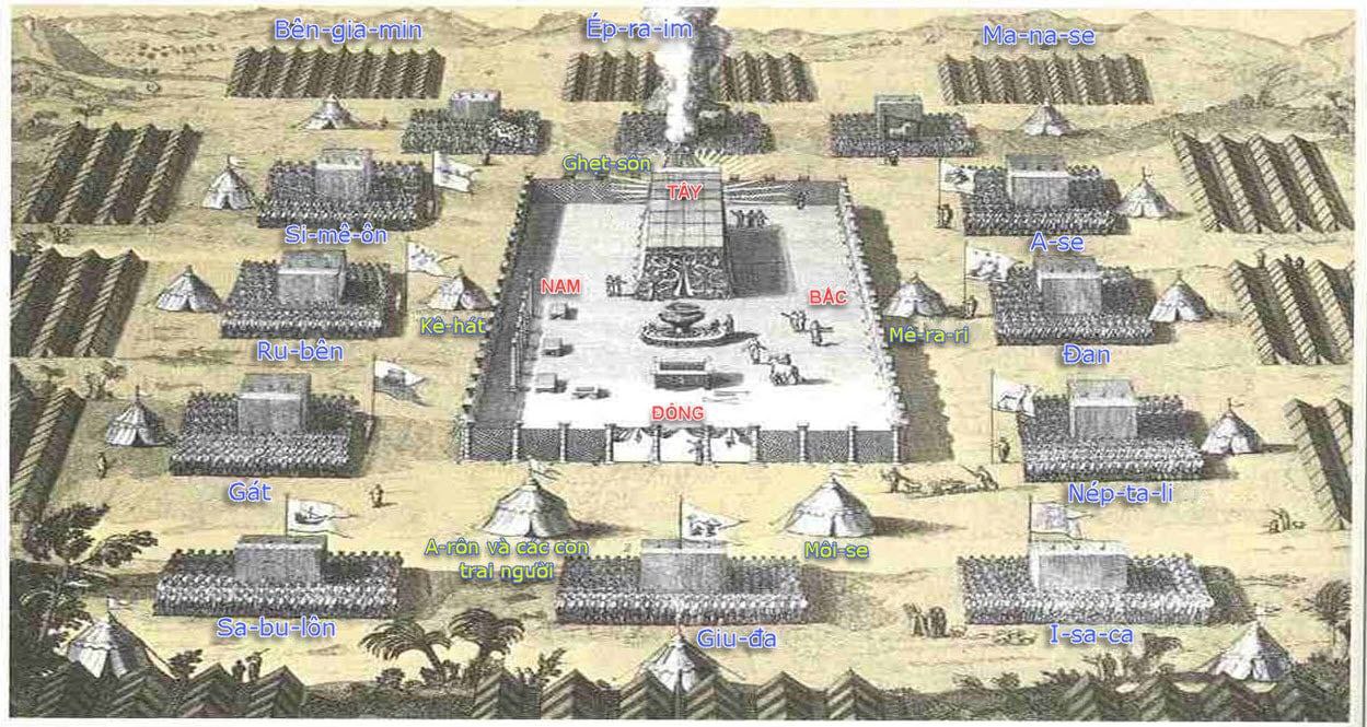 Qua sự phán dặn của Đấng Tự Hữu Hằng Hữu, mười hai chi phái được chia thành bốn trại quân được bố trí đóng tại bốn phía vây chung quanh Đền Tạm. Bao gồm: